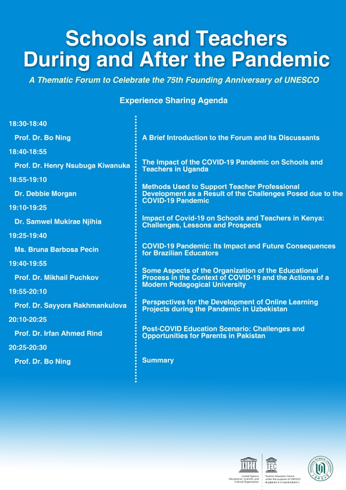 The COVID-19 Pandemic strikes international schooling heavily. In such a challenging condition, much attention from the whole society globally is given to the health and well-being of students. Teacher Education Centre , the international teacher organization under the auspices of UNESCO, shoulder the international responsibilities of understanding, communicating, and supporting teachers for their professional development and welfare, in correspondence with the necessities of irregular schooling in the COVID-19 Pandemic. We are now inviting educational administrators, teacher educators and researchers to participate in this grand gathering. We hope that the Forum would help colleagues from the world put forward their ideas and actions in schooling and teacher professional development by examining the policies and practices from an international perspective and exploring cures to the common problems.