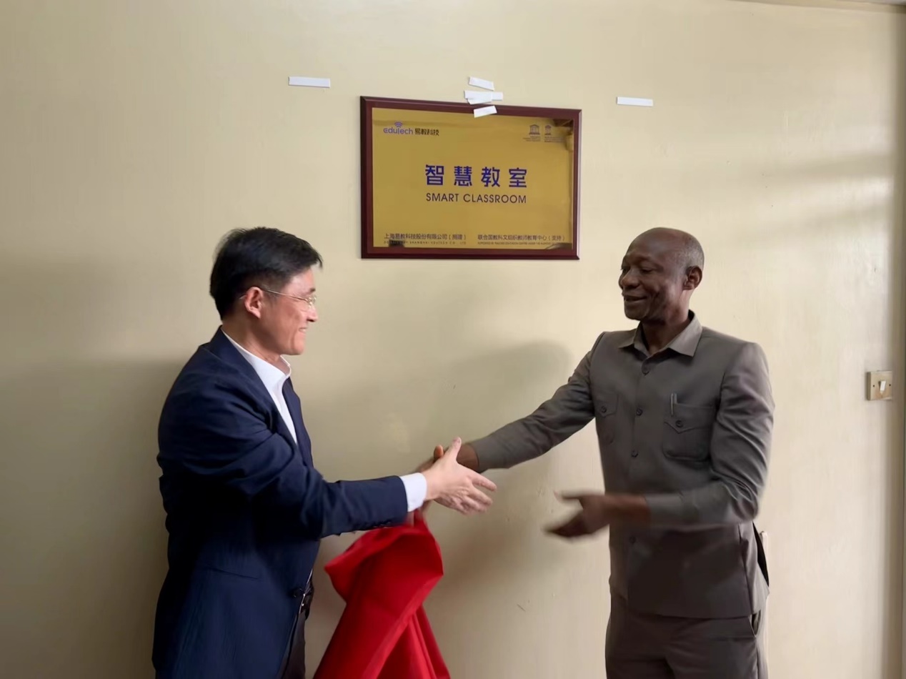 总结致辞后,中坦双方与会代表共同见证并揭幕由联教中心支持、上海易教科技股份有限公司捐赠的智慧教室。