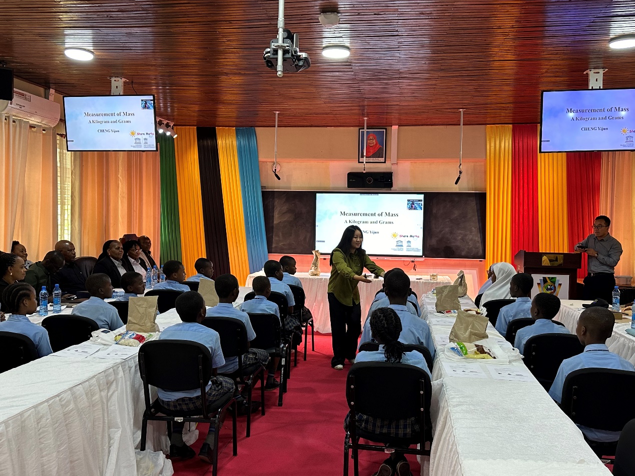 欢迎仪式后,上海市洋泾菊园实验学校数学教师成懿君使用智慧教室进行了教学公开课展示,中坦双方主要领导、达累斯萨拉姆市多所学校代表参与听课。课后,黄兴丰教授组织志愿团成员和现场40余位坦桑尼亚教师以及线上其他3所受捐赠智慧教室学校的50余位教师共同开展教研活动。