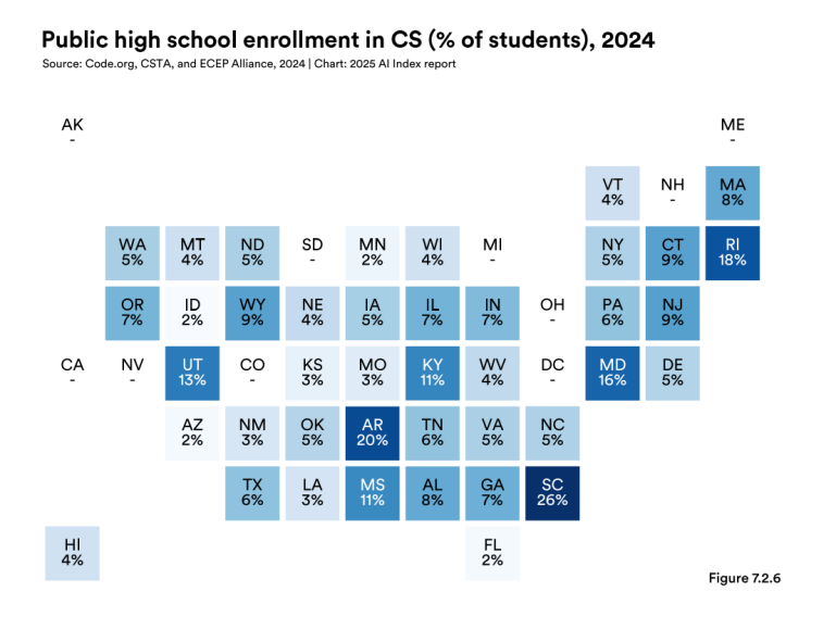 一是与上一学年相比,美国高中计算机科学课程的参与人数略有增加,但差距依然存在。学生参与情况因所在州、种族、学校规模、地域、家庭收入、性别及残障状况而呈现显著差异。根据覆盖美国41个州的计算机科学课程参与数据显示,学生参与况整体滞后。2020-2021学年仅有5.1%的高中生参与计算机科学课程,到2023-2024学年仅微增至6.4%。各州参与率差异悬殊,南卡罗来纳州高中生计算机科学课程参与率达26%,而佛罗里达、亚利桑那和爱达荷三个州均仅达2%(如图1)。