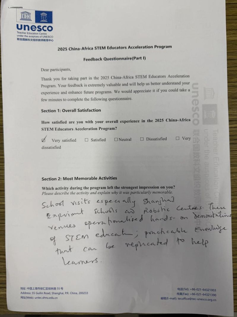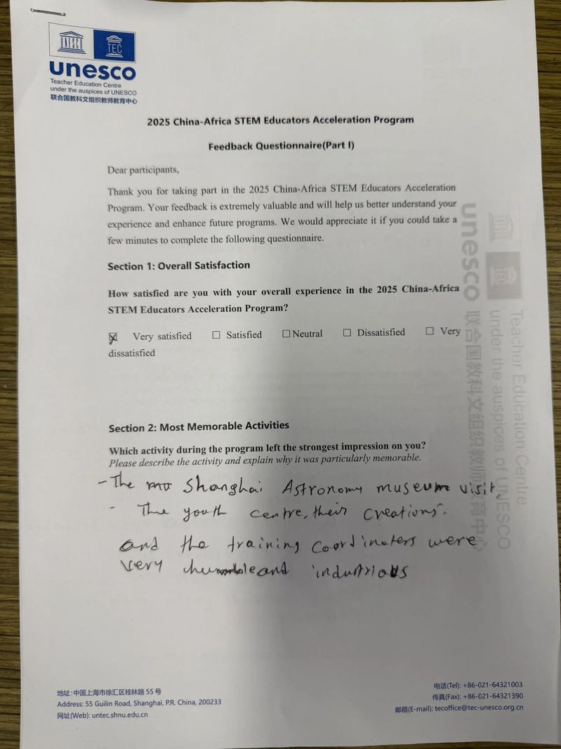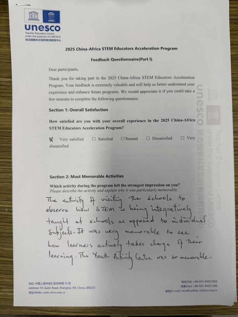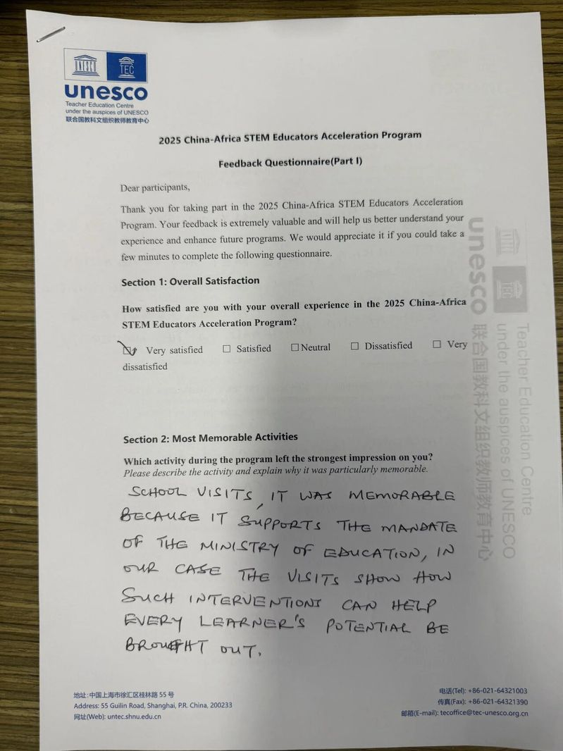 根据研修班成员填写的项目反馈表,此次研修参与人员对项目普遍表示高度满意,特别是在专家讲座、研讨会及学校参观等环节收获颇丰。活动体验方面,天文馆的参观令大家印象深刻,展示了中国在科学、艺术与人文领域的卓越成就,以及对世界和平与繁荣的贡献;学校实地访问则让参与者对中国学生在实践能力与综合素养方面的出色表现赞叹不已,也让他们亲眼见证学校如何通过有效干预激发每位学习者的潜能。在收获方面,参与者提高了实践教学能力、应用技能、合作经验、领导力及技术教育知识,建立了与非洲各国的教育联系,并学习了如何将文化元素融入STEM教育。展望未来,他们期待在教育政策、AI教育应用、以及具体学科中的人工智能整合等方面继续深入学习。整体而言,参与者认为本次培训内容实用、组织有序,感受到中国政府对教育的重视与投入,并高度评价中国的教育体系、组织能力及教育规划水平。通过此次项目,他们认为中国在STEM教育方面充满创新活力、目标清晰且发展迅速,极具启发性与鼓舞力。
