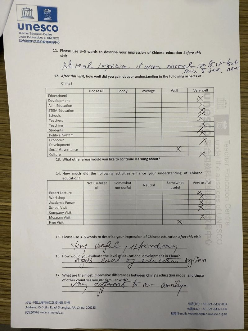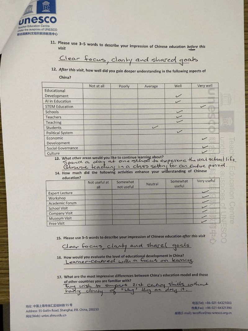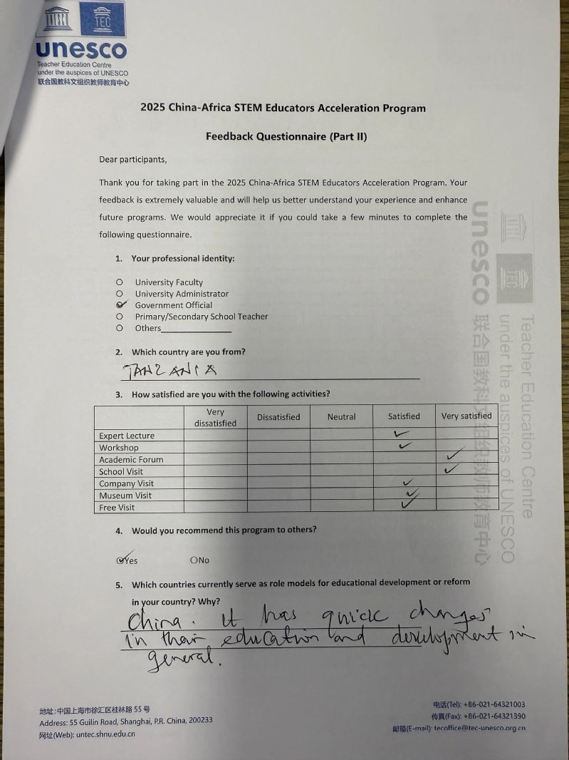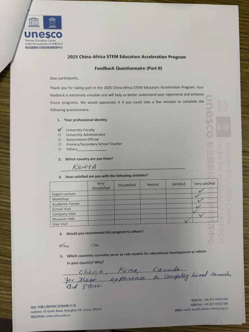 根据研修班成员填写的项目反馈表,此次研修参与人员对项目普遍表示高度满意,特别是在专家讲座、研讨会及学校参观等环节收获颇丰。活动体验方面,天文馆的参观令大家印象深刻,展示了中国在科学、艺术与人文领域的卓越成就,以及对世界和平与繁荣的贡献;学校实地访问则让参与者对中国学生在实践能力与综合素养方面的出色表现赞叹不已,也让他们亲眼见证学校如何通过有效干预激发每位学习者的潜能。在收获方面,参与者提高了实践教学能力、应用技能、合作经验、领导力及技术教育知识,建立了与非洲各国的教育联系,并学习了如何将文化元素融入STEM教育。展望未来,他们期待在教育政策、AI教育应用、以及具体学科中的人工智能整合等方面继续深入学习。整体而言,参与者认为本次培训内容实用、组织有序,感受到中国政府对教育的重视与投入,并高度评价中国的教育体系、组织能力及教育规划水平。通过此次项目,他们认为中国在STEM教育方面充满创新活力、目标清晰且发展迅速,极具启发性与鼓舞力。