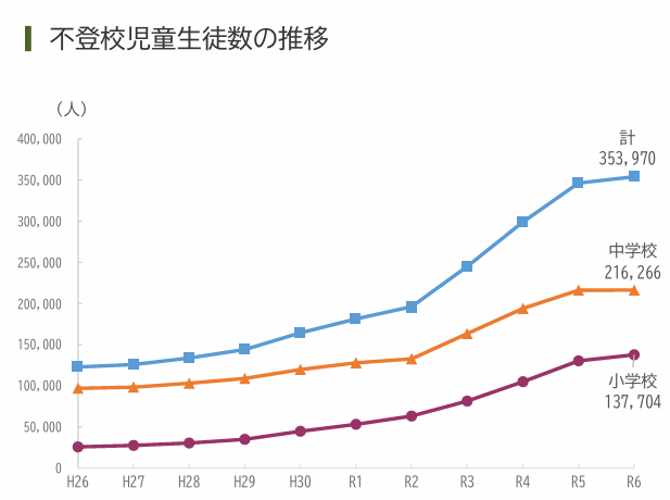 文部科学省于2025年10月29日公布了2024年度的《与中小学生的问题行为、拒绝上学等学生指导方面诸多问题相关的调查》(「児童生徒の問題行動・不登校等生徒指導上の諸課題に関する調査」),其结果表明,2024年日本拒绝上学的中小学生数连续12年增加,总数为353970,首次超过35万人,为过去最高。另一方面,在中小学阶段,拒绝上学学生人数的增长率相较去年皆有10个百分点以上的降幅。