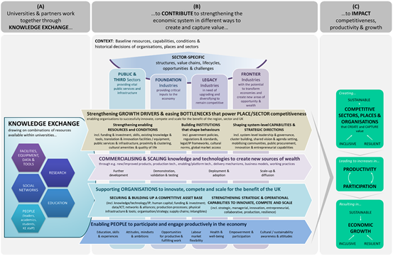 该框架梳理了大学可以通过知识交流为经济增长做出贡献的四个核心维度:第一,推动知识与技术的商业化及规模化,开辟财富新源泉;第二,助力企业开展创新、提升竞争力、实现规模化发展,促进英国经济繁荣;第三,提升劳动者经济参与度与生产效率;第四,完善系统性增长动力机制,疏通制约区域和产业竞争力的关键瓶颈,为企业创新发展与规模扩张创造更优环境。