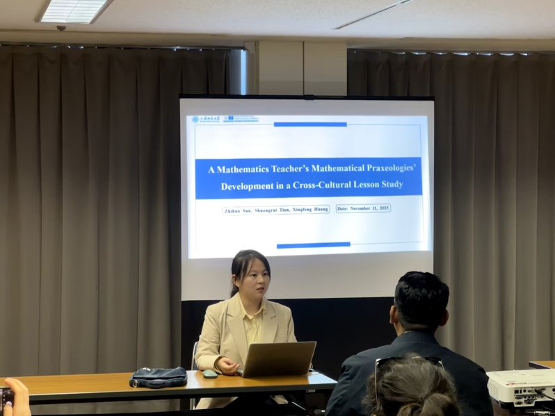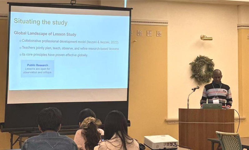 博士生阿尔伯特·肯西马(Albert Kissima)作题为“从变式理论视角分析跨文化课例研究中数学教师教学实践的演变”的报告。该研究以变式理论为指导,探讨中国数学教师在跨文化教案研究背景下的教学实践变迁,强调通过识别学习对象的“关键特征”并系统调整核心要素,引导学习者把握数学概念本质。通过记录中国教师教学策略的演变,研究深入揭示了跨文化对话如何有效拓展教学方法体系,以促进概念理解的持续深化。