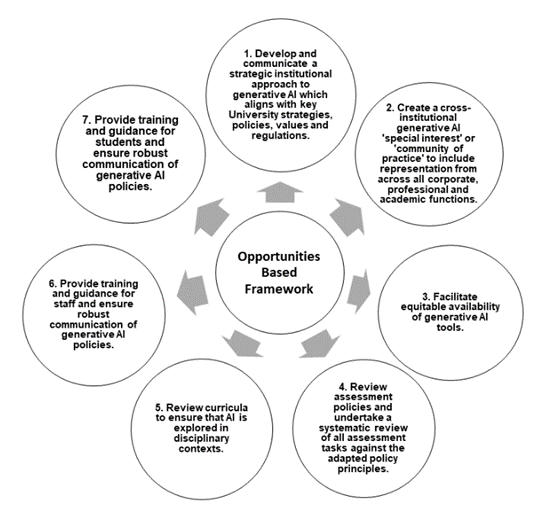 为制定在高等教育生成式AI战略,需综合考量涵盖机构财务与数字基础设施、学术与教学因素、人员配备与资源配置的多方视角。此外,还应关注生成式AI相关的宏观议题,包括社会公平正义、可持续发展及其伦理应用等。生成式AI“特别兴趣小组”或“实践社区”能够为AI战略方向提供信息输入,助力关键利益相关方群体的能力建设,促进学术单位与行政部门内部及彼此间的实践共享。