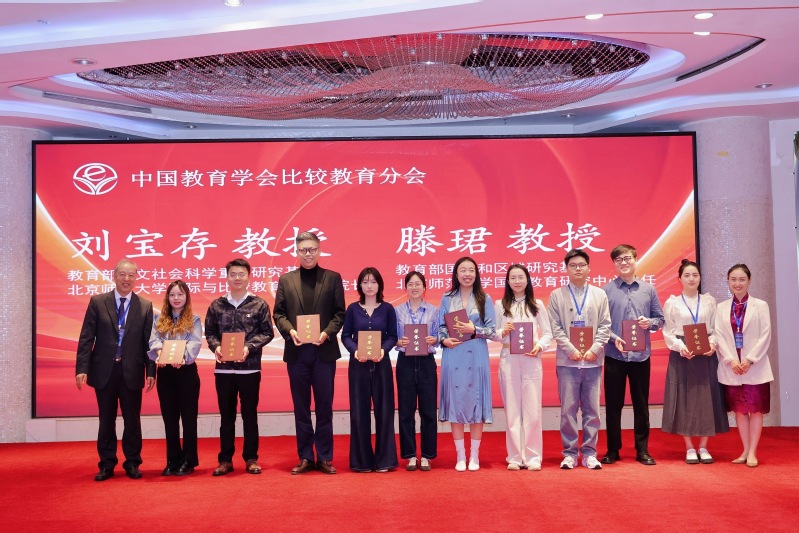 开幕式后,《比较教育研究》首届高水平共建“一带一路”教育研究青年学者征文一等奖获奖者名单公布,我院宋佳副教授和硕士生刘青佩合作撰写的文章《“一带一路”倡议下构建中非STEM教师教育合作新范式:基于非洲17204份质性访谈的分析》荣获一等奖。中国教育学会比较教育分会理事长刘宝存教授,中国教育学会比较教育分会副理事长兼秘书长滕珺教授为获奖者颁发证书。