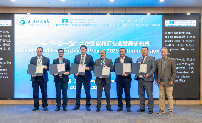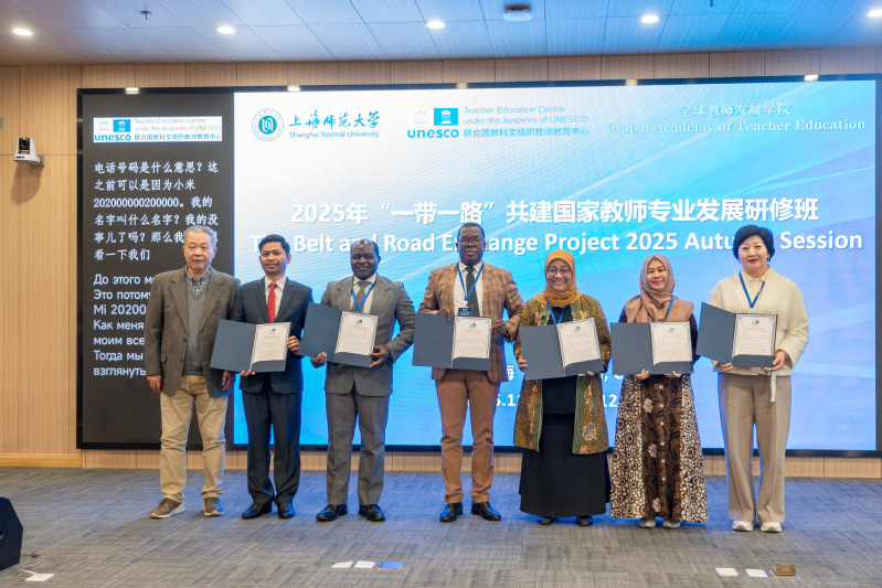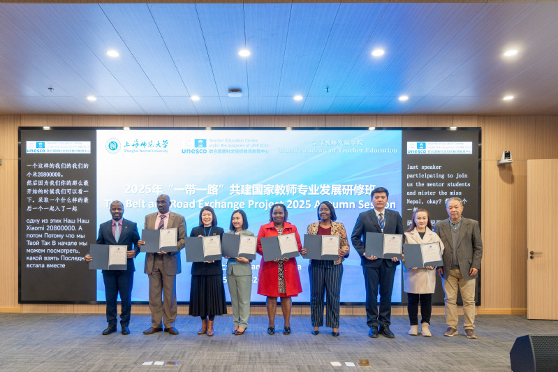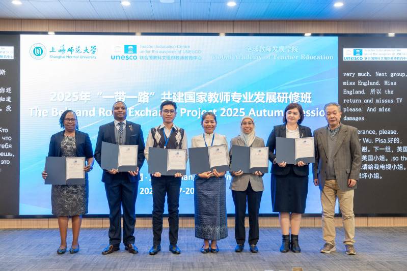 2025年12月8日,“一带一路”共建国家教师专业发展研修班闭幕式在联合国教科文组织教师教育中心(简称“联教中心”)世承讲堂举行。联教中心主任张民选教授、副主任胡国勇教授,上海师范大学国际教师教育中心副主任王洁教授,以及来自14个国家的约40位教育官员、教师教育者、专家学者及中小学教师一同出席了闭幕式。闭幕式由王洁教授主持。